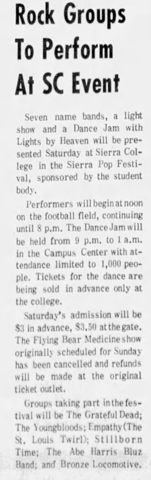 As per Corry Arnold citing the local Placer Herald, "the original posters pitched a two-day festival (May 3-4) with the Dead, the Youngbloods and a bunch of acts on Mercury Records. It was reduced to a one-day event, daytime on the football field and night-time at the gym. The Dead had to have played outdoors in the afternoon (they had Winterland that night), not clear whether the Youngbloods played the football field or the gym, I think the former."
