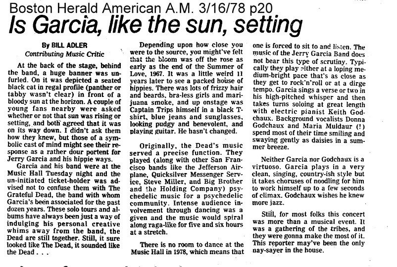 review: [mixed-positive] Morse 19780315: notes an hour delay between sets, with Jerry and Maria rehearsing. Muldaur indicates she has just joined the band.