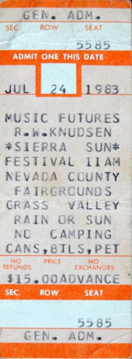 preview: "Sierra Sun Music Festival Set for Sunday," Mountain Democrat and Eldorado News, July 20, 1983, p. B7: "The first Sierra Sun Music Festival will be held Sunday at the Nevada County Fairgrounds in Grass Valley. It is sponsored by Music Futures and R.W. Knudson. Gates open at 10 a.m. with festivities running from 11 a.m. to 8 p.m." Band headlining. "This will be The Band's only outdoor concert in America this summer. Also appearing will be the Jerry Garcia Band, Etta James, harmonica virtuoso Norton Buffalo, Kate Wolf, Lisa Nemzo and Peter Wilson". "The festival is sponsored by 97 KROY FM, BAM Magazine, Budweiser Beer, Chico Natural Soda, Anchor Steam Beer, Alta Dena Certified Dairy and The Mountain Messenger newspaper". Schedule inside: 10 AM - gates open; 10:50 Peter Wilson performs the National Anthem; 11 am Lisa Nemzo, 11:30 Kate Wolf, 1 pm Norton Buffalo, 2:30 PM Etta James, 4 pm JGB, 6 pm The Band.