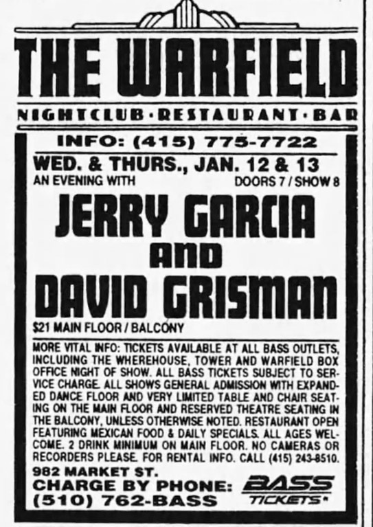 Sue: the two-night guarantee was $47,000, so $1,500 less per night than when JGB played the Warfield in October '93.